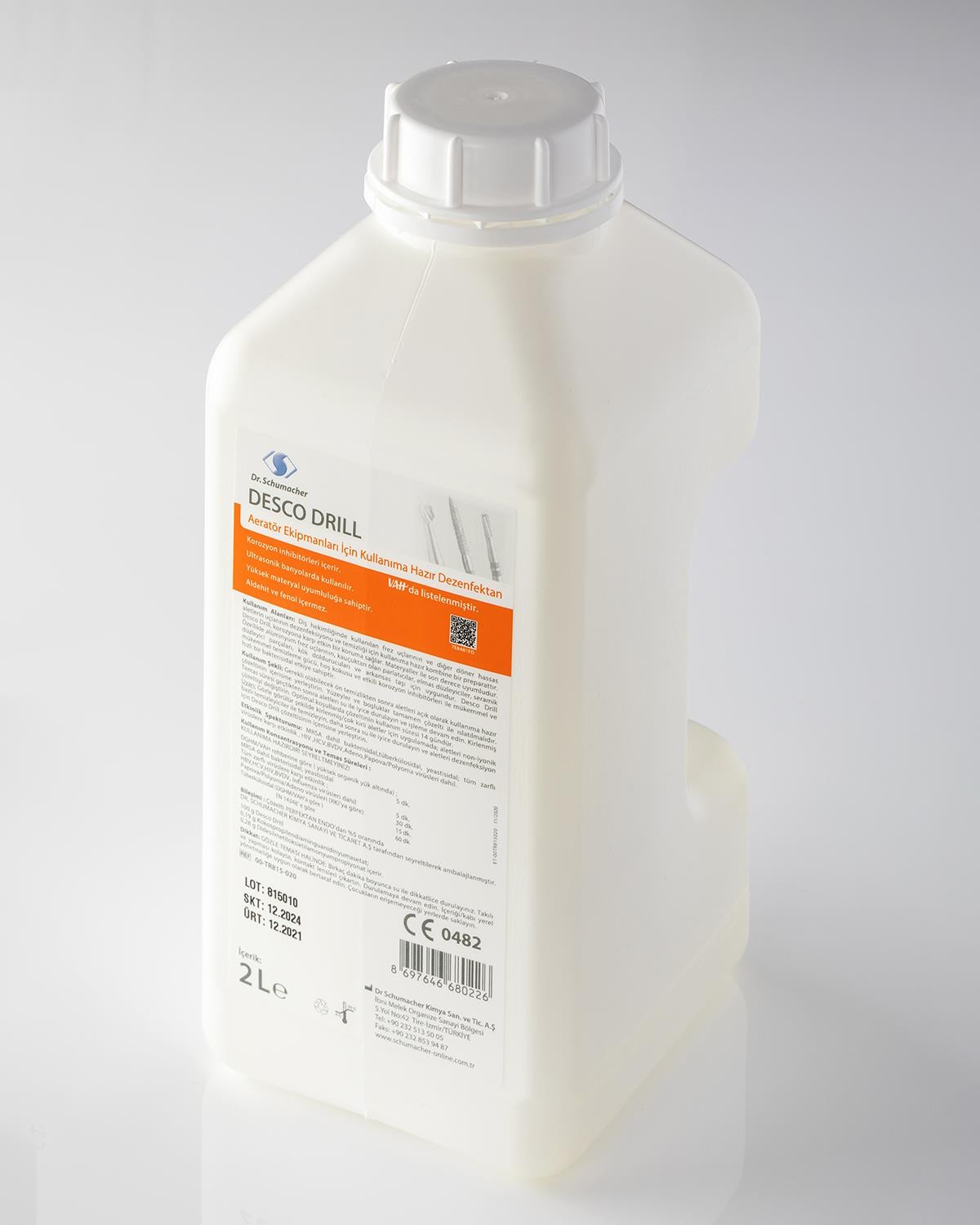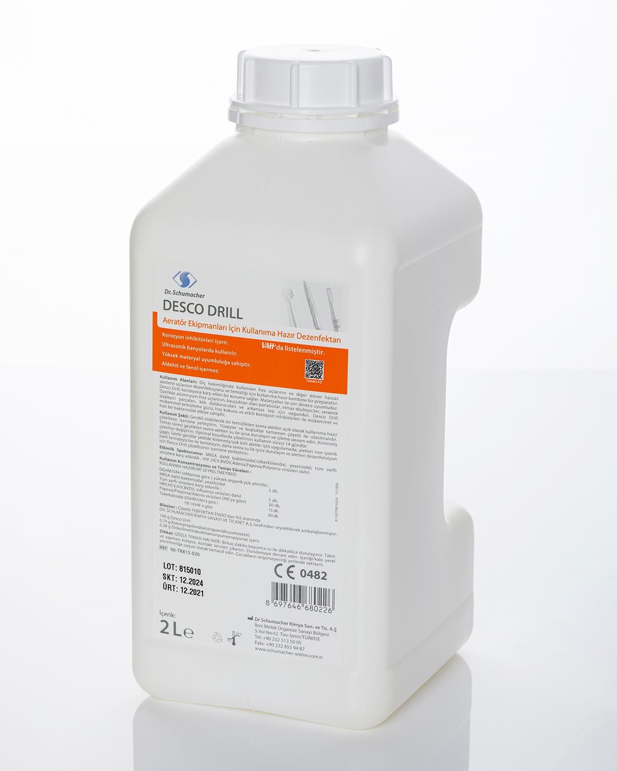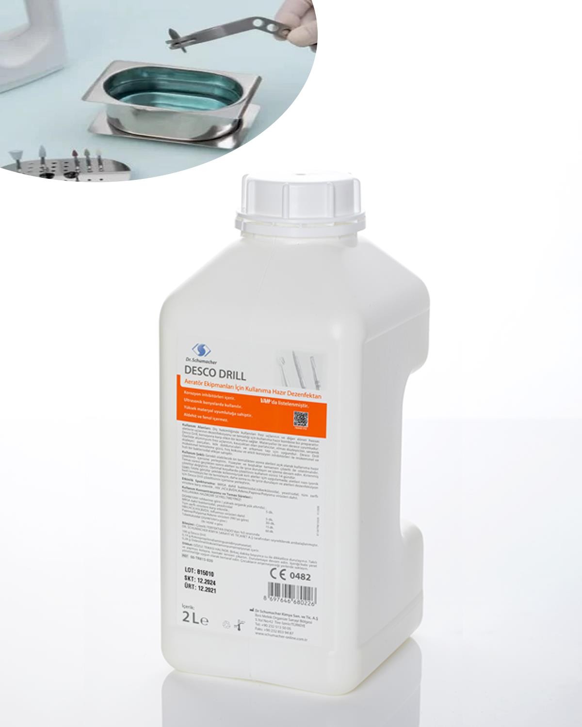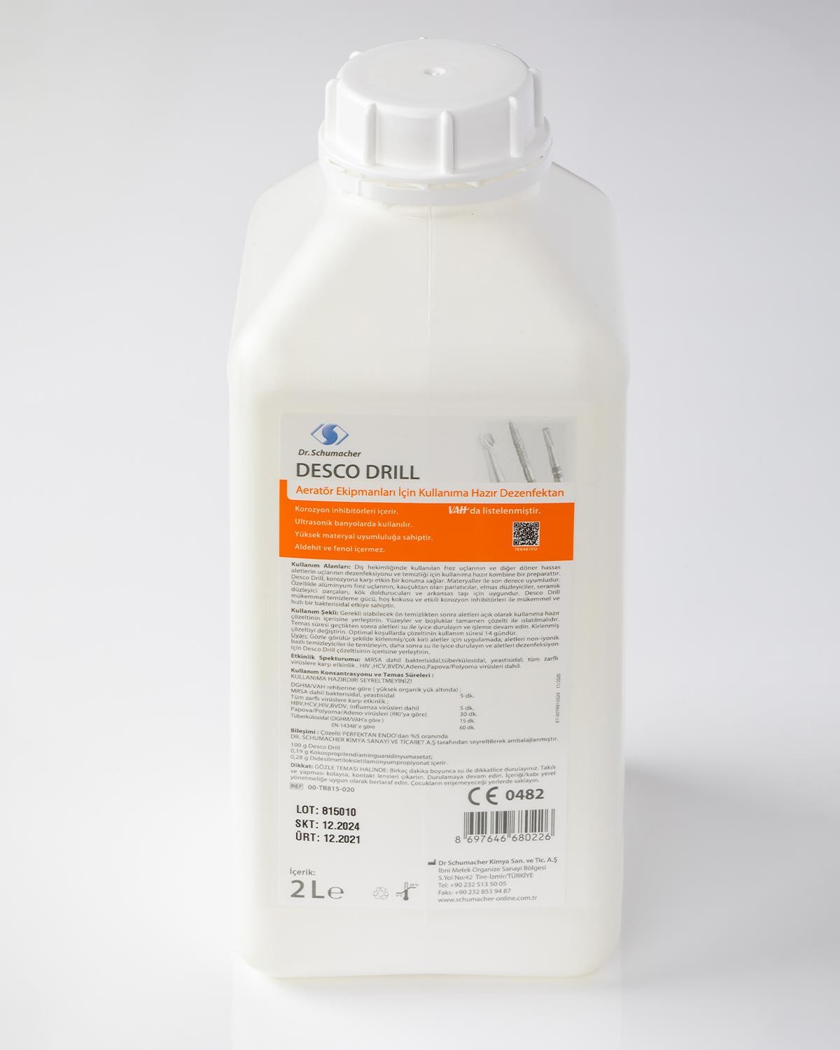 DESCO DRILL, diş hekimliğinde kullanılan frezler ve diğer döner hassas aletlerin tek işlemde temizliği ve dezenfeksiyonunu gerçekleştiren kullanıma hazır bir preparattır. Aldehit ve fenol içermez. İçerdiği etkili korozyon inhibitörleri sayesinde dezenfeksiyon işlemi esnasında malzemelere zarar vermez. Kullanımı sırasında rahatsızlık verici koku oluşturmaz, hoş kokuludur. Diş hekimliğinde kullanılan frez uçları ve diğer döner hassas aletlerin uçlarının dezenfeksiyonu ve temizliği için kullanıma hazır kombine bir preparattır. Özellikle alüminyum frez uçları, kauçuktan olan parlatıcılar, elmas düzleyiciler, seramik düzleyici parçalar, kök doldurucuları ve arkansas taşı için uygundur. DESCO DRILL korozyona karşı etkin bir koruma sağlar. Materyaller ile son derece uyumludur. DESCO DRILL mükemmel temizleme gücü, hoş ko kusu ve etkili korozyon inhibitör ile mükemmel ve hızlı bir bakterisidal etkiye sahiptir.