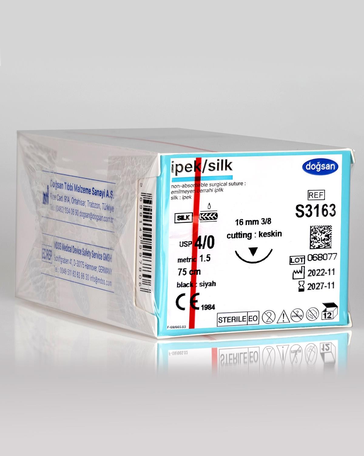 > TANIM: İPEK iplik, fibroin adı verilen organik proteinden elde edilmiş, emilmeyen, steril cerrahi bir ipliktir. Bu protein, Bombycidae ailesinin evcilleştirilmiş türü olan Bombyx mori (B.Mori) İPEK böceğinden elde edilir. İPEK iplikler doğal yağ ve yapışkanlarından temizlenmek için işleme tabi tutulur. İPEK siyah renkte (Hematein Logwood siyah) ve silikon ile kaplıdır. Ham (Virjin) İPEK iplik, bükülmüş ve mavi renkte (Metilen Mavisi) USP 8/0 (EP 0.4) olarak mevcuttur. İPEK, Avrupa Farmakopesi (EP) ve Amerika Birleşik Devletleri Farmakopesi (USP) tarafından saptanmış absorbe olmayan cerrahi iplikler için gerekli olan tüm şartları karşılar. KULLANIM AMACI: İPEK, genel olarak yumuşak doku yaklaştırması ve/veya bağlanmasında, oftalmik ve kardiyovasküler cerrahi kullanımı da dahil olmak üzere kullanılır. Sadece tek kullanımlıktır. KLİNİK PERFORMANS ÖZELLİKLERİ: İPEK iplik, dokuda önce akut inflamasyon reaksiyonuna, sonrasında da bağ doku lifi ile ipliğin yavaş yavaş kapsül içine alınmasına yol açar. İPEK iplikler absorbe edilmediği halde, vücutta (in-vivo) İPEK liflerinin zamanla bozulması, iplik mukavemetinin yavaş yavaş kaybedilmesine neden olabilir. KLİNİK FAYDA: İPEK sütürler, açık yaraları dikmek için kullanıldığında enfeksiyonu sınırlayarak ve olabildiğince minimum doku enflamasyonu sağlayarak, dokuları yaklaştırmak için kullanılır. İPEK sütürler ayrıca yumuşak dokular veya diğer cihazlar için bir fiksasyon sistemi olarak kullanılır.