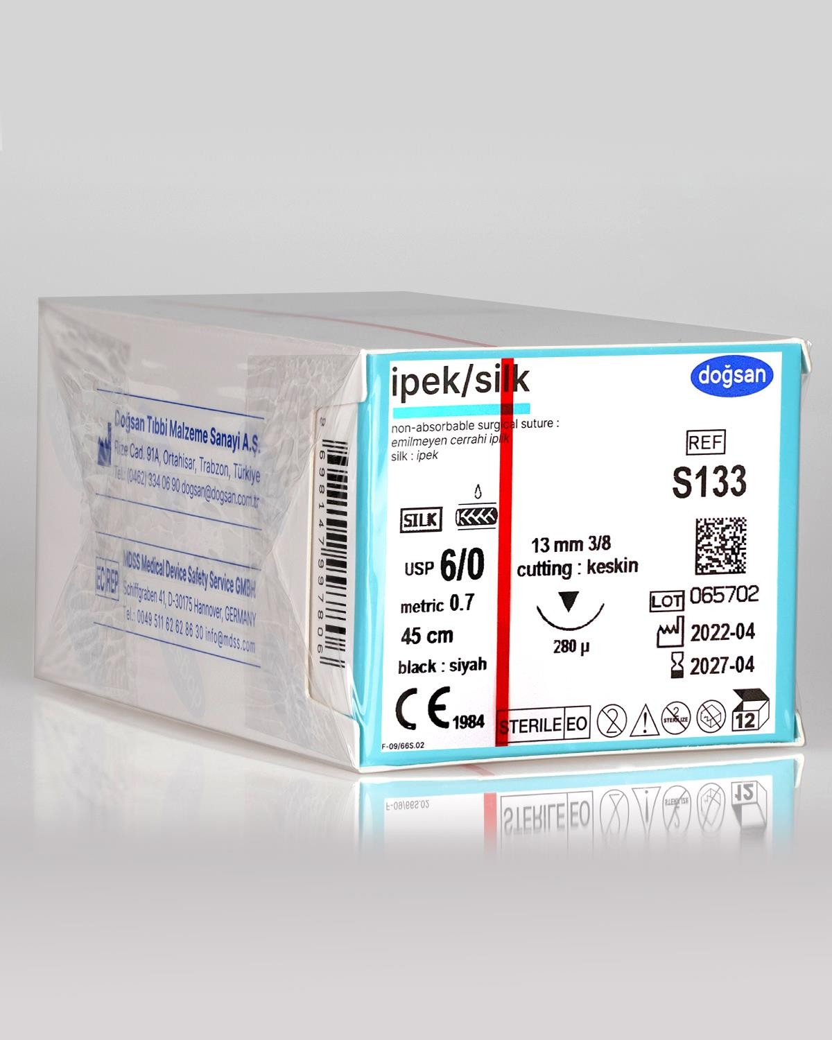> TANIM: İPEK iplik, fibroin adı verilen organik proteinden elde edilmiş, emilmeyen, steril cerrahi bir ipliktir. Bu protein, Bombycidae ailesinin evcilleştirilmiş türü olan Bombyx mori (B.Mori) İPEK böceğinden elde edilir. İPEK iplikler doğal yağ ve yapışkanlarından temizlenmek için işleme tabi tutulur. İPEK siyah renkte (Hematein Logwood siyah) ve silikon ile kaplıdır. Ham (Virjin) İPEK iplik, bükülmüş ve mavi renkte (Metilen Mavisi) USP 8/0 (EP 0.4) olarak mevcuttur. İPEK, Avrupa Farmakopesi (EP) ve Amerika Birleşik Devletleri Farmakopesi (USP) tarafından saptanmış absorbe olmayan cerrahi iplikler için gerekli olan tüm şartları karşılar. KULLANIM AMACI: İPEK, genel olarak yumuşak doku yaklaştırması ve/veya bağlanmasında, oftalmik ve kardiyovasküler cerrahi kullanımı da dahil olmak üzere kullanılır. Sadece tek kullanımlıktır. KLİNİK PERFORMANS ÖZELLİKLERİ: İPEK iplik, dokuda önce akut inflamasyon reaksiyonuna, sonrasında da bağ doku lifi ile ipliğin yavaş yavaş kapsül içine alınmasına yol açar. İPEK iplikler absorbe edilmediği halde, vücutta (in-vivo) İPEK liflerinin zamanla bozulması, iplik mukavemetinin yavaş yavaş kaybedilmesine neden olabilir. KLİNİK FAYDA: İPEK sütürler, açık yaraları dikmek için kullanıldığında enfeksiyonu sınırlayarak ve olabildiğince minimum doku enflamasyonu sağlayarak, dokuları yaklaştırmak için kullanılır. İPEK sütürler ayrıca yumuşak dokular veya diğer cihazlar için bir fiksasyon sistemi olarak kullanılır.