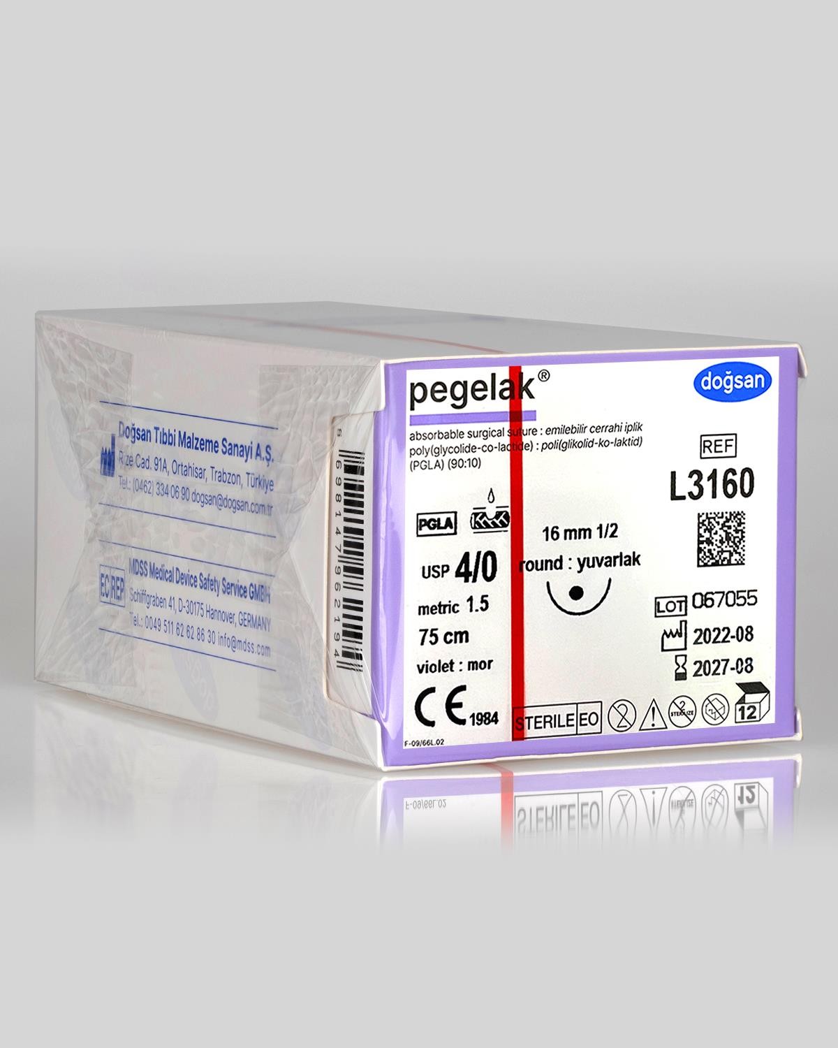Pegelak 4/0 16 1/2 Yuvarlak (●) 75cm PGLA Emilebilir Sütür 12 Ad./Pkt; Adlı ürün Cerrahi operasyonlarda kullanılması önerilir.