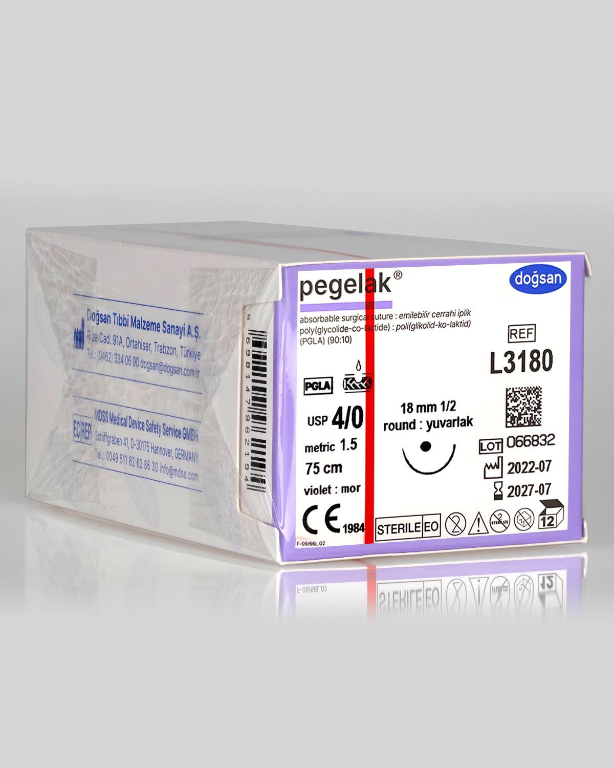 Pegelak 4/0 18 1/2 Yuvarlak (●) 75cm PGLA Emilebilir Sütür 12 Ad./Pkt; Adlı ürün Cerrahi operasyonlarda kullanılması önerilir.