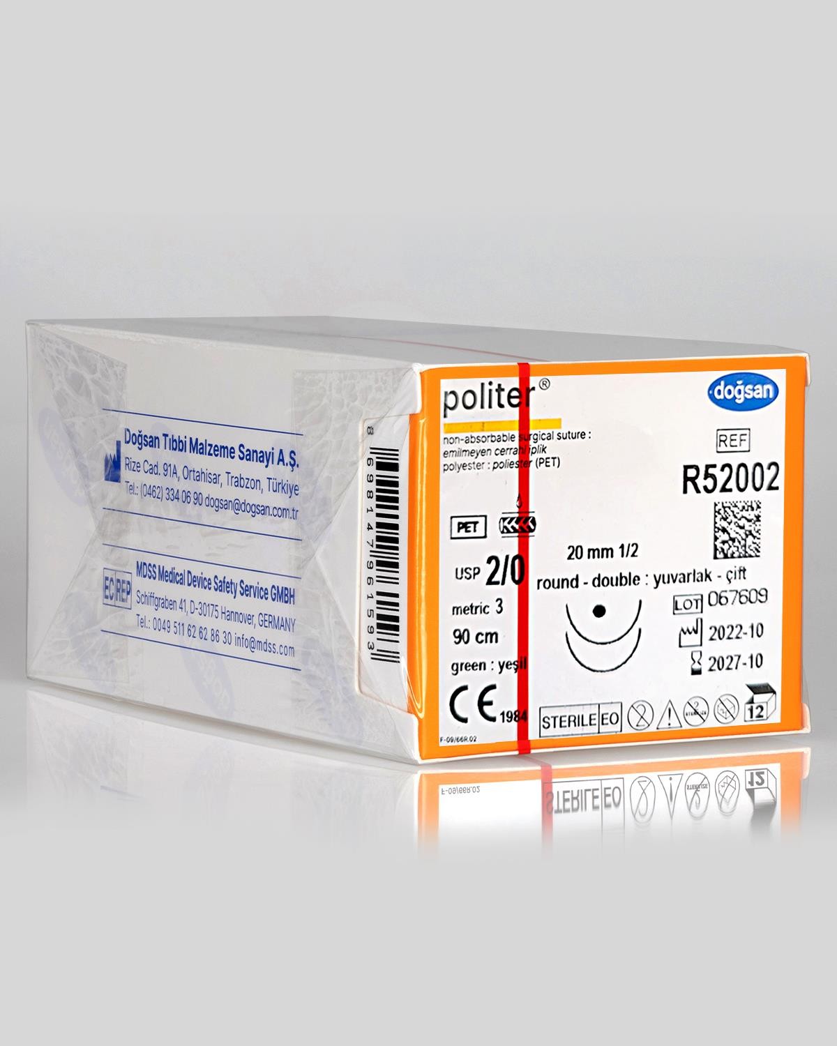 > TANIM: POLİTER® örgülü, absorbe olmayan, silikon kaplı, polyesterden (polietilen terafitalat) imal edilmiş steril cerrahi iplik malzemesidir. Cerrahi iplik çok ince filamanların örülmesi ve sonra silikon karışımı ile kaplanmasıyla elde edilir. POLİTER® kolay görünmesi için yeşil (D & C Green No 6) ile boyanmıştır. Bazı kodlar renksiz, şeffaf olarak bulunur. Pledget (plejit, yama) ameliyat ipliği aksesuarı olarak kullanılan, emilmeyen, boyasız PTFE’den (politetra-fluoroetilen) kesilmiş parçadır. POLİTER® Avrupa Farmakopesi (EP) ve Amerika Birleşik Devletleri Farmakopesi’nin (USP) Absorbe Olmayan Cerrahi İplikler gerekliliklerine uygundur. KULLANIM AMACI: POLİTER® genel olarak yumuşak doku yakınlaştırılması ve/veya bağlanmasında, kardiyovasküler, ortopedik, genel cerrahi, nörolojik ve göz cerrahisinde kullanılır. Pledget, yalnızca kardiyovasküler cerrahide ameliyat ipliği ile doku yüzeyi arasında bir yastık oluşturma ve, baskı oluşan yüzeyi genişletmek için kullanılır. Sütürler ve pledgetlar tek kullanımlıktır. KLİNİK PERFORMANS ÖZELLİKLERİ: POLİTER® dokuda minimum akut inflamasyon reaksiyonuna sonrasında da bağ doku ile cerrahi ipliğin yavaş yavaş kapsülleşmesine yol açar. Hayvanlarda implante çalışmaları polyester sütürün zamanla mukavemetinin belirgin seviyede azalmadığını göstermiştir. Hem polyester fiberleri hem de kaplama malzemesi farmakolojik olarak zararsızdır. KLİNİK FAYDA: POLİTER®, kardiyovasküler ve nörolojik prosedürler dahil olmak üzere genel yumuşak doku operasyonlarında güvenli yaklaştırma ve / veya ligasyon sağlar. POLİTER®, açık yaraları dikmek için kullanıldığında olabildiğince minimum doku enflamasyonu sağlayarak, dokuları yaklaştırmak için kullanılır.