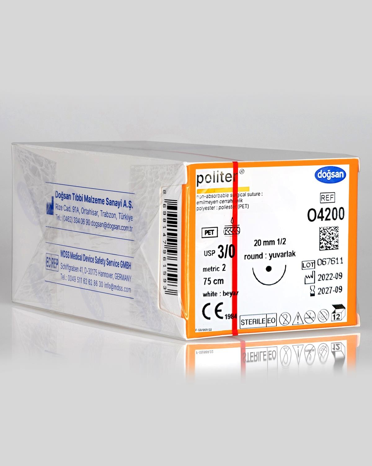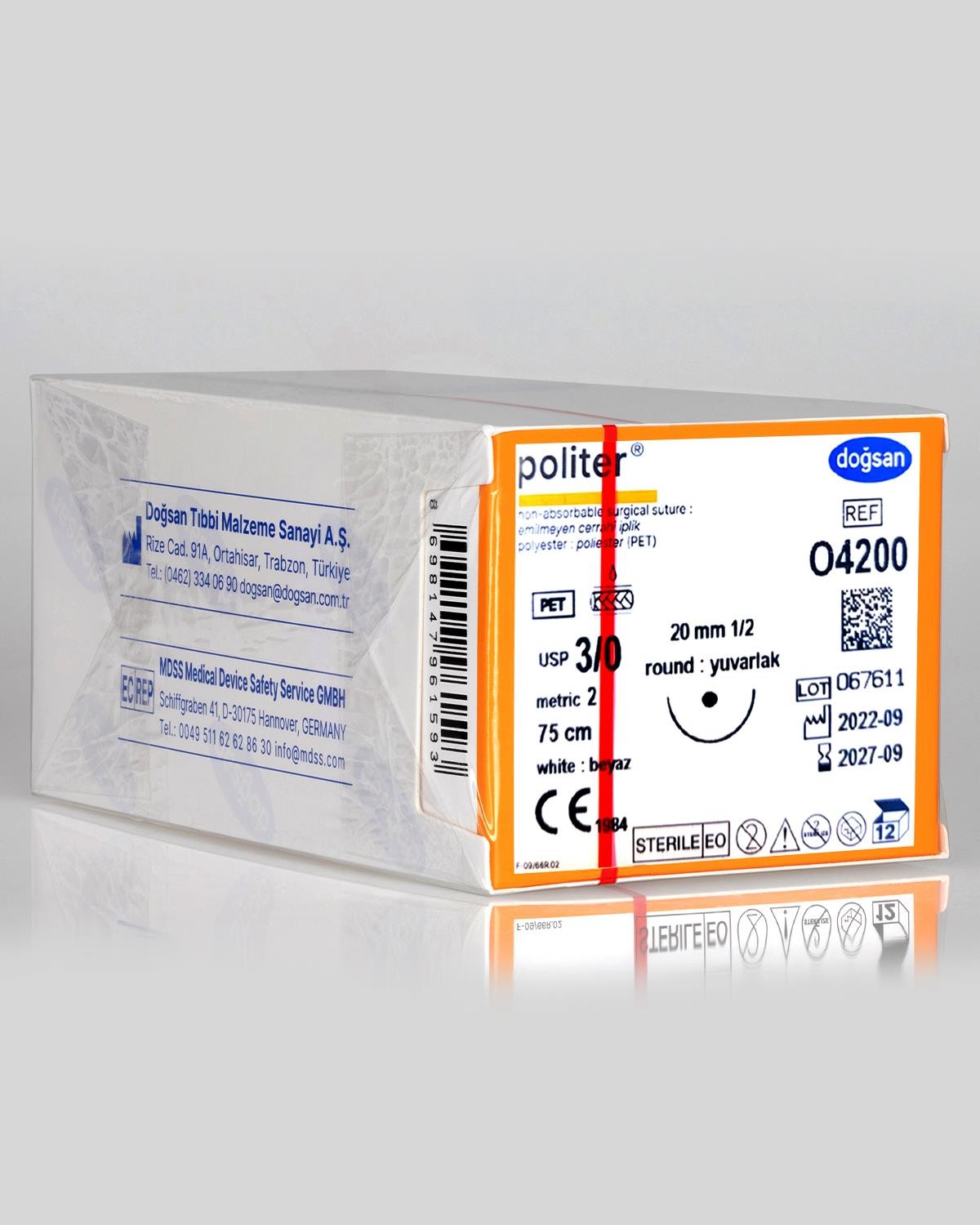 Politer 3/0 20 1/2 Yuvarlak (●) 75cm Polyester Emilemeyen Sütür 12 Ad./Pkt; Adlı ürün Cerrahi operasyonlarda kullanılması önerilir.