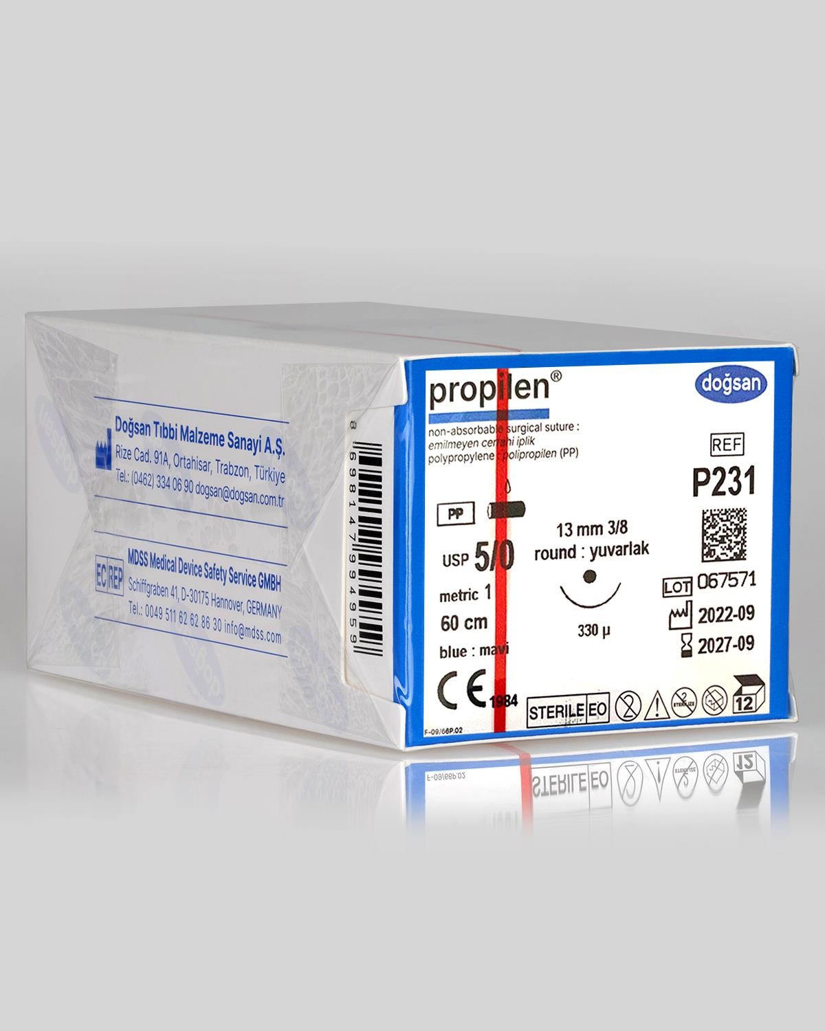 > TANIM: PROPİLEN sentetik, emilmeyen, steril monofilaman cerrahi ipliktir. Yüksek molekül ağırlığında izotaktik polipropilen polimerinden oluşmuştur. PROPİLEN kolay görünmesi için mavi (Bakır ftalosiyanin mavisi) boyanmıştır. Bazı kodlar renksiz, şeffaf olarak bulunur. PROPİLEN’in bazı kodları PTFE(politetrafluoroetylene) pledget ile yapılmaktadır. Pledget,ameliyat ipliği ile doku yüzeyi arasında bir yastık oluşturarak, baskı oluşan yüzeyi genişletmek için kullanılır. Ürün detayları katalogda yer almaktadır. PROPİLEN Avrupa Farmakopesinin (EP) ve Amerika Birleşik Devletleri Farmakopesinin (USP) Absorbe Olmayan Cerrahi İplikler gerekliliklerine 7/0 (EP 0.5) ve 6/0 (EP 0.7) ölçülerinde çap limitlerinin bazen biraz aşılması dışında uygundur. KULLANIM AMACI: PROPİLEN genel olarak yumuşak doku yakınlaştırması ve/veya bağlanmasında, kardiyovasküler, oftalmik ve nörolojik cerrahi, plastik ve rekonstrüktif cerrahide kullanılır. Sadece tek kullanımlıktır. KLİNİK PERFORMANS ÖZELLİKLERİ: PROPİLEN dokuda minimum akut inflamasyon reaksiyonuna sonrasında da bağ doku ile cerrahi ipliğin yavaş yavaş kapsulleşmesine yol açar. PROPİLEN absorbe edilmediği gibi, doku enzimlerinin aksiyonuna göre bozulma veya zayıflama durumu da oluşmaz. KLİNİK FAYDA: PROPİLEN sütürler, açık yaraları dikmek için kullanıldığında enfeksiyonu sınırladığı için dokuları yaklaştırmak için kullanılır, PROPİLEN sütürler ayrıca yumuşak dokular veya diğer cihazlar için bir fiksasyon sistemi olarak kullanılır. PROPİLEN absorbe edilmediği gibi, doku enzimlerinin aksiyonuna göre bozulma veya zayıflama durumu da oluşmaz. Dokulara yapışmadığından PROPİLEN’in dokudan çıkarılmasını kolaylaştırır. Monofilament olarak PROPİLEN, enfeksiyonda bulaşmaya karşı direnç gösterir, kontamine olmuş ve enfeksiyonlu yaralarda sinus oluşumunu ve cerrahi iplik ekstrüzyonunu engellemede veya minimize etmede başarıyla kullanılır. Dokulara yapışmaması PROPİLEN’in dokudan, çekip çıkarma amaçlı sütür uygulamalarında kullanılmasını kolaylaştırır.