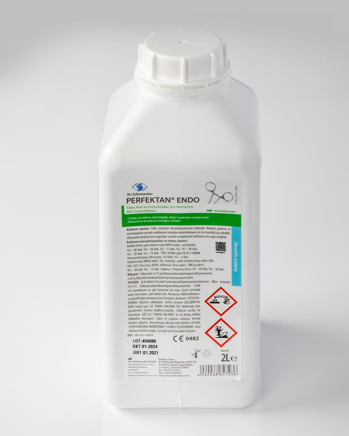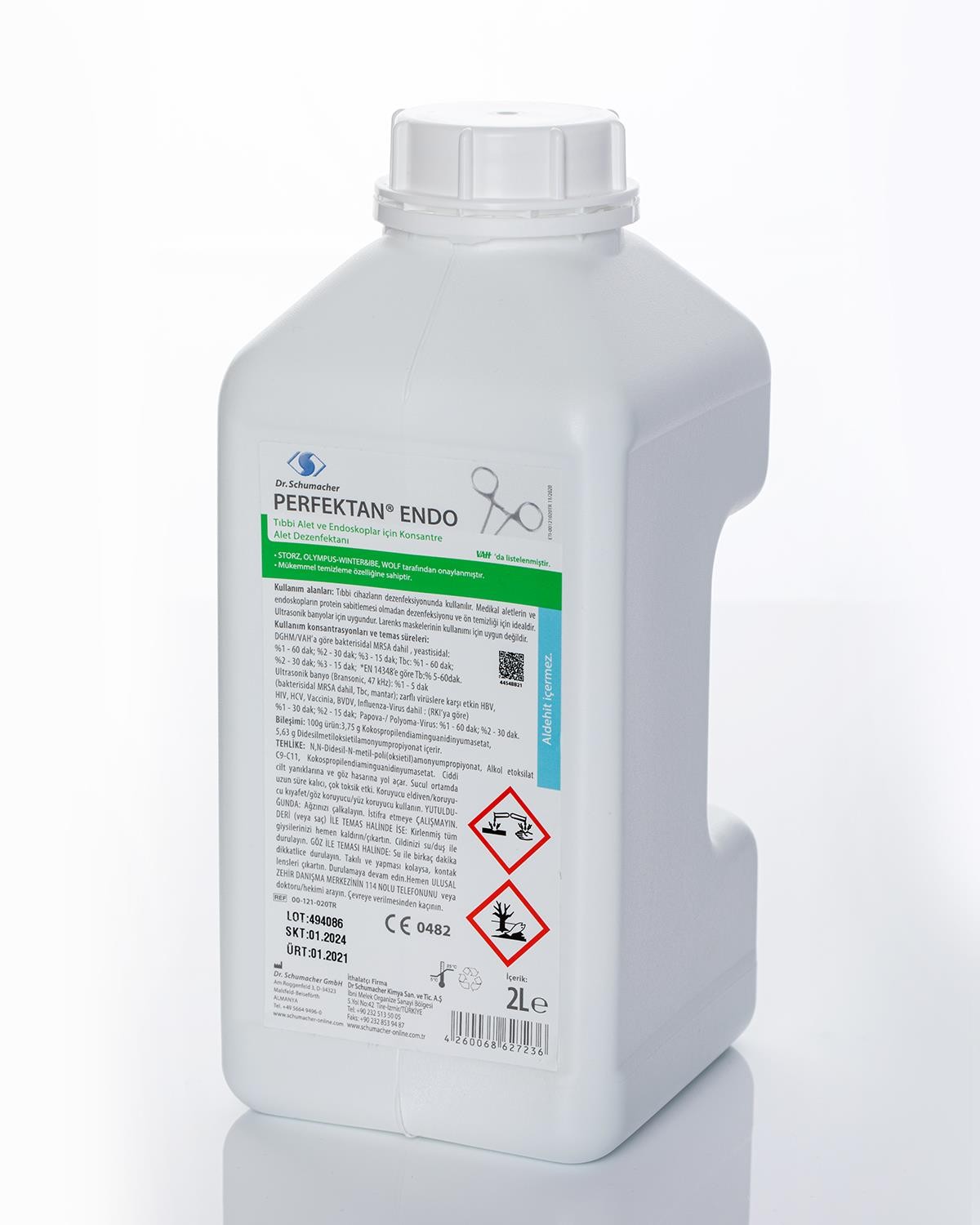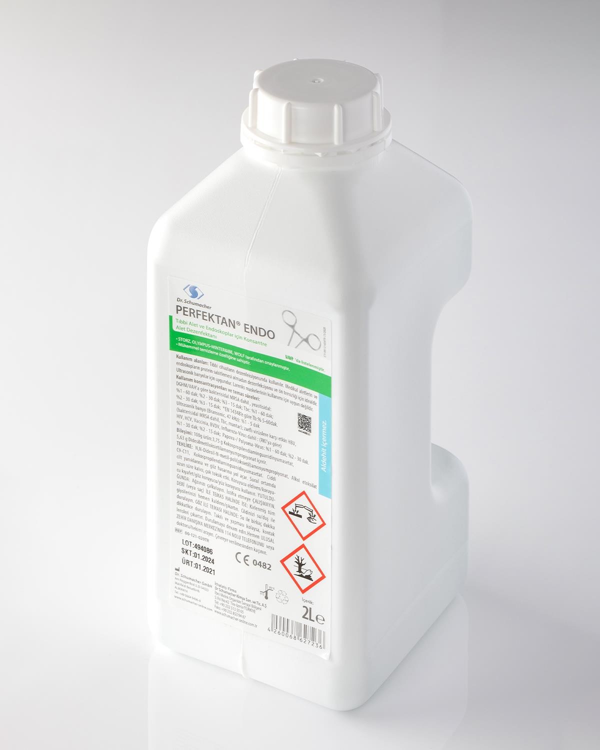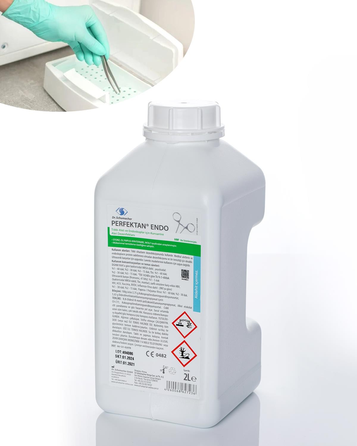 PERFEKTAN ENDO, patentli bir etken madde prensibe dayanan malzeme dostu, aktif temizleme gücüne sahip bir alet dezenfektanıdır. PERFEKTAN ENDO, mükemmel temizleme özelliklerine sahip, aldehit ve fenol içermeyen bir temizleyici dezenfektanı olup, endoskopların ve aletlerin dezenfeksiyonu ve sabitlemeden ön temizliği için idealdir. Muazzam antimikrobiyal özellikleri sayesinde aletlerin yeniden kullanıma hazırlanması sırasında yüksek derecede kişisel korunma sağlanır. Bileşimi: 100 g solüsyon: 3,75g kokos propilen diamin guanidinyum asetat, 5,63g didesil metiloksietil amonyum propiyonat %5-15 noniyonik yüzey aktif maddeler ve parfüm içerir. Etki Spektrumu ve Etki Süreleri: Her türlü cerrahi aletin ve fleksible endoskopların temizlik ve dezenfeksiyonu için uygulama tavsiyesi - PREVENT - 3 % - 15 dk - 2 % - 30 dk. Tıbbi cihazların dezenfeksiyonu için uygulama önerisi : PREVENT - 5 % - 60 dk Tüberkülosidal etkinlik EN14348 - PREVENT - 5 % - 60 dk Tıbbi aletlerin, bükülebilir ve sabit endoskopların protein sabitlenmesi olmadan dezenfeksiyonu ve temizliği için idealdir. Tıbbi cihazların manuel daldırma banyolarında ultrasonik banyolarda kullanımı için uygundur. Larenks maskelerin kullanımı için uygun değildir.Kullanım Şekli Daldırma banyosunda dezenfeksiyon ve temizleme işlemi: Aletleri gerek görülen ön temizlik işlemlerinden sonra çalışma solüsyonuna yerleştirin. Gerekli görürseniz mekanik temizlik yapınız. Etki süresi dolduktan sonra aletleri su ile iyice durulayın ve kullanıma hazırlama işlemlerine devam edin. Ultrasonik banyolarda kullanıma uygundur. Çalışma solüsyonu optimum şartlarda 14 gün boyunca kullanılabilmektedir.